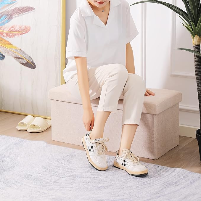 CUYOCA Storage Ottoman Bench Foldable Seat Footrest Shoe Bench End of Bed Storage with Flipping Lid, 75L Storage Space, 30 inches Linen Fabric Dark Blue