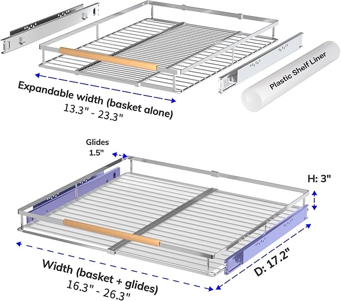 - Expandable Width: This slide out cabinet organizer adds the ability to adjust the width. Size small is perfect for cabinet openings measuring 16.3" to 26.3" in width and 17.3" in depth. Upgrade your storage space and enjoy easy access to your items with these practical and functional pull-out shelves.