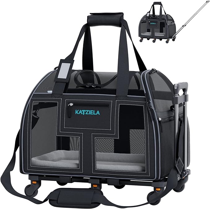 Airline Compliant Pet Carrier - Rolling Portable Travel Carry Crate for Small Dog, Puppy or Cat - Soft Removable Wheeled Design with Mesh Window Sides - Airplane and TSA Compliant- by Katziela