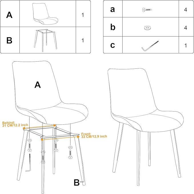 - EASY TO ASSEMBLE : The package includes a set of 4 Dining Chairs and all screws and hardware. Installation steps are also elementary. Even a lady or a teen can finish the assembly within the provided hardware. It only takes about 10 minutes from unpacking to complete assembly.