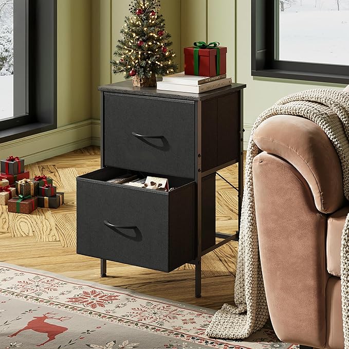 - 【2 Fabric Drawers】This compact nightstand features 2 removable storage drawers that keep your bedtime essentials, books, electronics, or clothes neatly organized and within easy reach. It's perfectly sized for cozy bedrooms, dorms, and apartments.