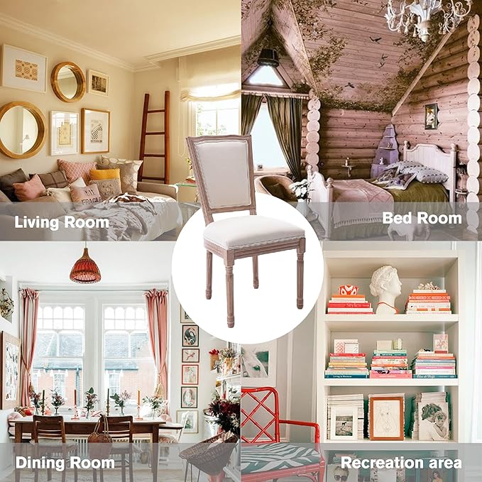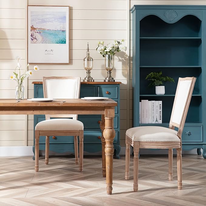 - 🪑Chic French Design: Vintage French dining chairs set of 2, with upholstered dining chairs and finely carved wooden frames, can't stop its elegance and nobility anywhere and provide you with unparalleled comfort. The beauty of bright oak color and linen beige cloth collide with each other, creating a different French charm in your dining environment.