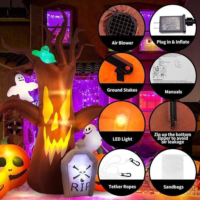 - Superior Material: The Halloween inflatable Dead Tree with White Ghost, Pumpkin, and Tombstone inflatable is made of thickened waterproof polyester material. Soft, light and firm, sturdy, and durable, which is against rips and tears, In addition, we provide 6 ropes, 6 ground plugs, and 6 buttons to keep them standing firmly, moreover, you can also use bundle pockets filled with stones to fix it to the ground, double ensure the stability.
