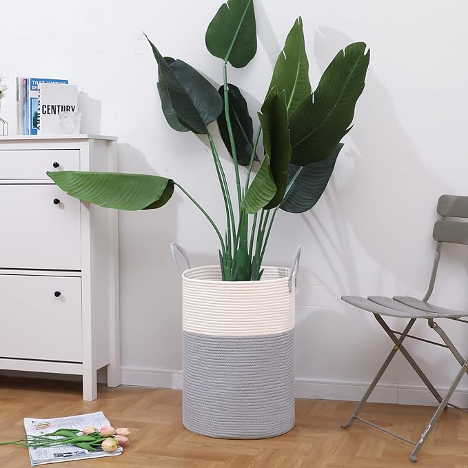 VIPOSCO Large Laundry Hamper, Tall Woven Rope Storage Basket for Blanket, Toys, Dirty Clothes in Living Room, Bathroom, Bedroom - 58L Grey & White