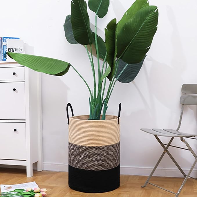 VIPOSCO Large Laundry Hamper, Tall Woven Rope Storage Basket for Blanket, Toys, Dirty Clothes in Living Room, Bathroom, Bedroom - 72L Brown & Black
