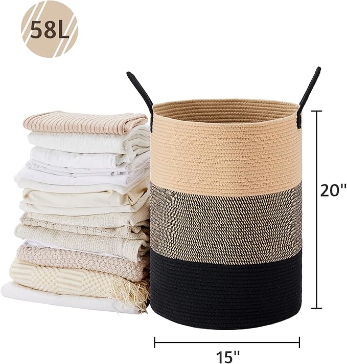 VIPOSCO Large Laundry Hamper, Tall Woven Rope Storage Basket for Blanket, Toys, Dirty Clothes in Living Room, Bathroom, Bedroom - 58L Brown & Black