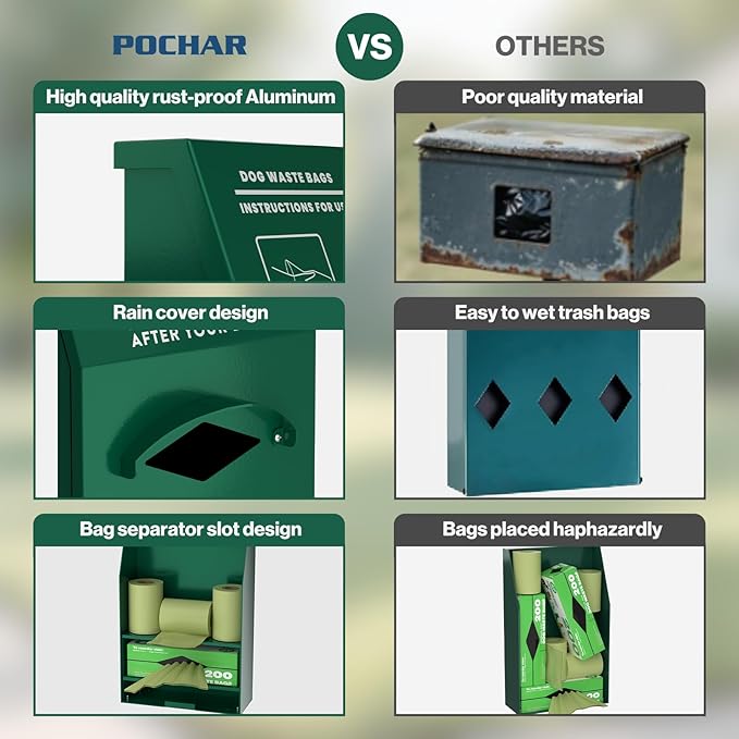 - ALUMINUM DOG BAG DISPENSER STATION: Our pet poop bag holder is made of 14 gauge (2mm) powder-coated aluminum. The rust-resistant material makes this dog waste bag station the ideal dog park accessories.