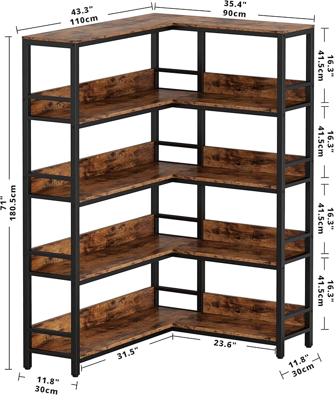 IRONCK Corner Bookshelf 5 Tiers, Industrial Corner Bookcase with Baffles Etagere, L Shaped Bookshelves with Metal Frame, Corner Shelf Storage Rack for Living Room Home Office