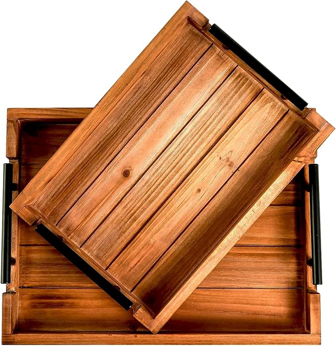 - ✅Stackable Design Easy to carry – these serving trays are both durable and light weight. the thick and sturdy,DURABLE IRON HANDLES. Designed with iron handles, these rustic nesting trays combines antique looks and convenience. The sturdy metal handles makes the transporting foods and drinks safely and securely.