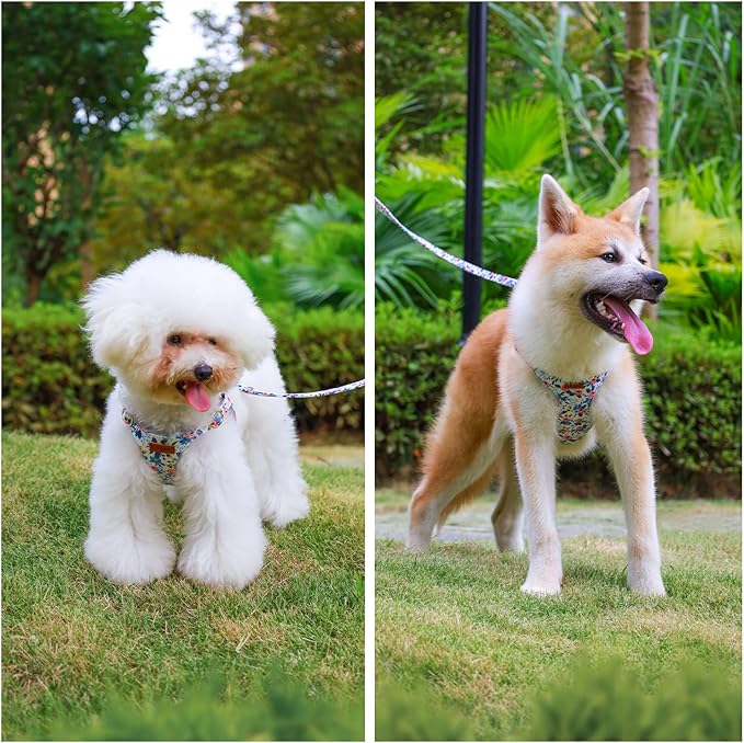 - HIGH-QUALITY MATERIAL: Our dog harness is made of high-quality cotton and microfiber, which is soft, comfortable and breathable, will not harm the dog's skin and hair, and provide a comfortable use experience. At the same time, the metal material of the small dog harness and leash set is sturdy and durable, will not fade and deform, will not rust when exposed to water, and has a longer service life.