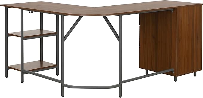 - L-shape desk in an industrial wood grain touch with steel accents.