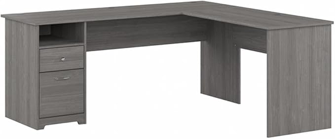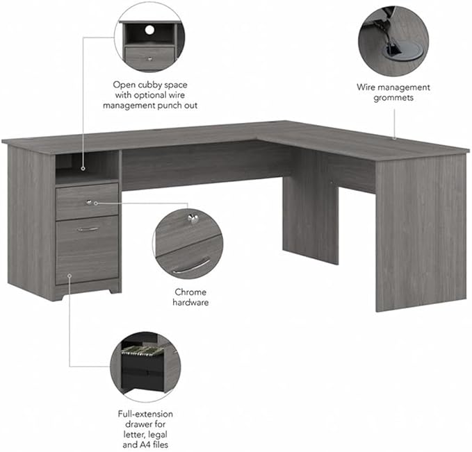 - WORKSPACES MADE STYLISH: Spread out and maximize your work efforts with Bush Furniture's Corner Desk. Our L desks for home office offer plenty of space to spread out with materials and has two drawers that comfortably hold letter, legal and A4 size files.