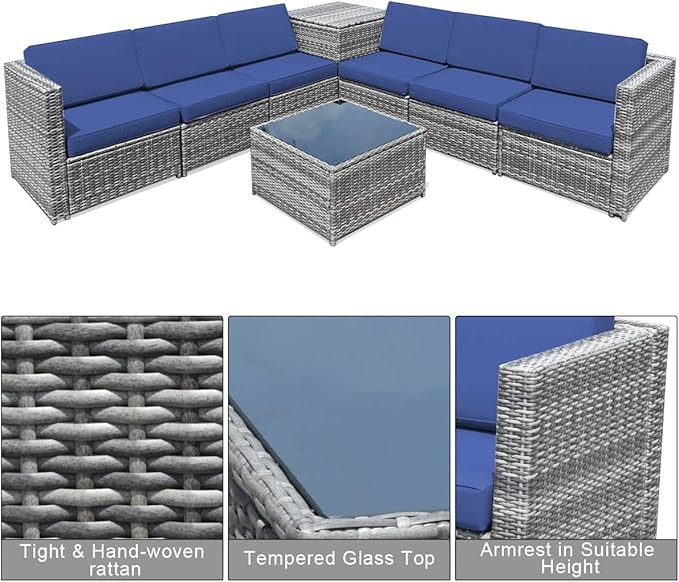 - 【A Complete Sofa Set】 This 8 pieces sofa set includes 6 sofas, 1 storage box, 1 coffee table, 6 seat cushions and 6 back cushions. The cushions are made of non-woven fabrics and comfortable sponge. Besides, the covers can be detached and washed, which is convenient to keep clean.If you put this patio furniture set outside while wanting it looks brand new, you can cover the waterproof cover.