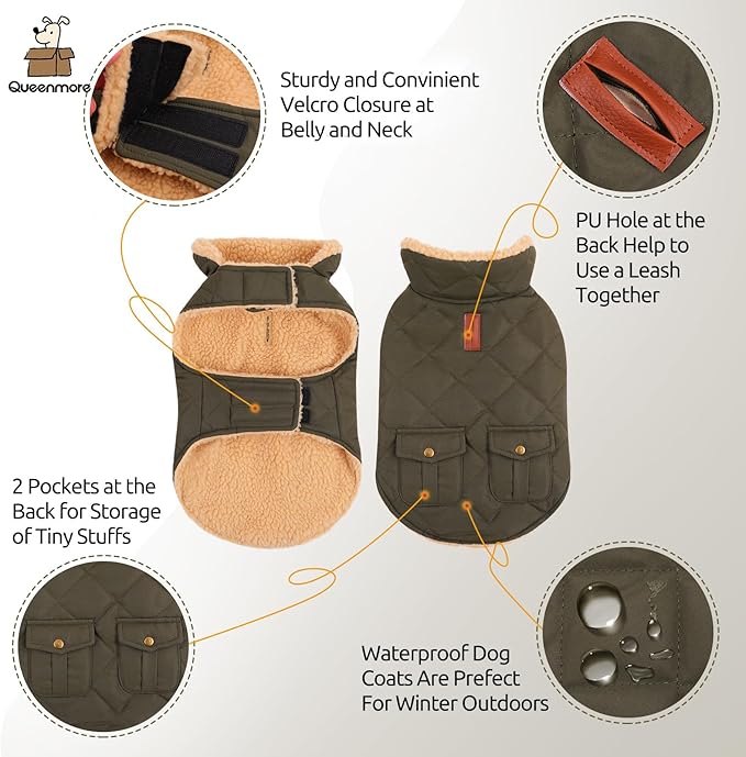- CUTE STORAGE POCKETS AT THE BACK - The stylish quilting pockets at the back are eye-catching. It is easy to store some snacks, garbage bag or the leash to the storage pockets at the back of the dog jacket.