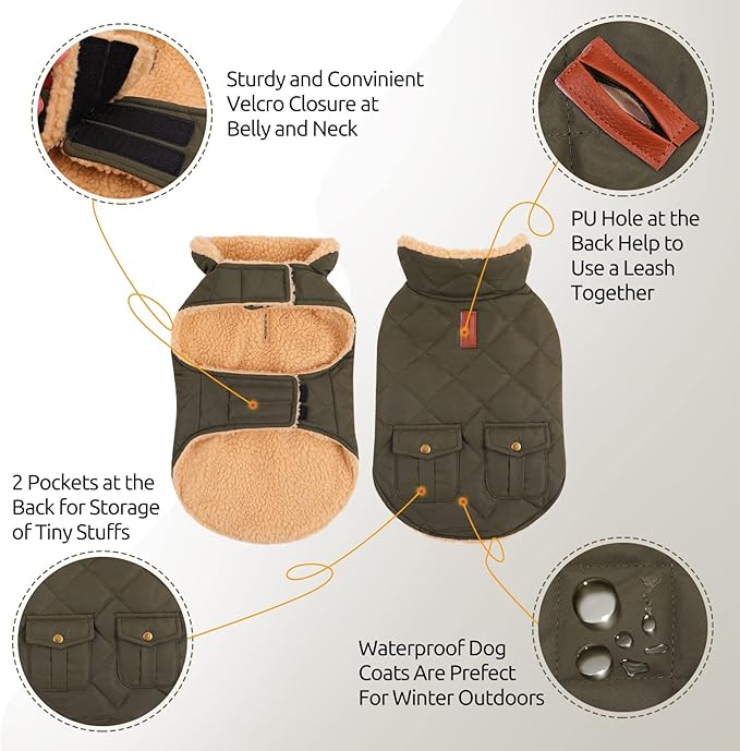 - CUTE STORAGE POCKETS AT THE BACK - The stylish quilting pockets at the back are eye-catching. It is easy to store some snacks, garbage bag or the leash to the storage pockets at the back of the dog jacket.