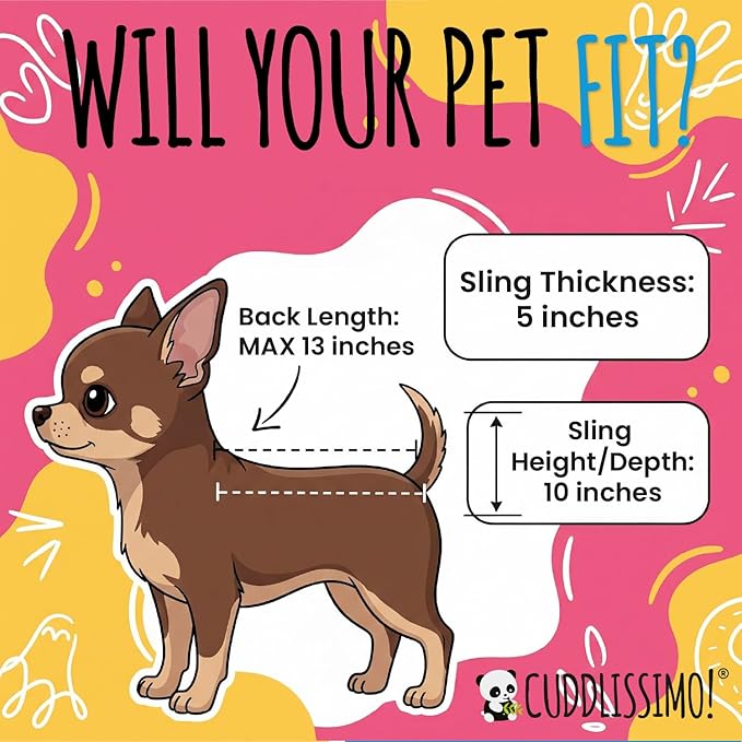 - πΆ PERFECT FOR MEDIUM PETS - Cuddlissimo! pet sling carrier is designed for medium sized dogs or cats, up to 12 pounds in weight. This dog sling has a padded bottom, and the neck opening is fully adjustable.