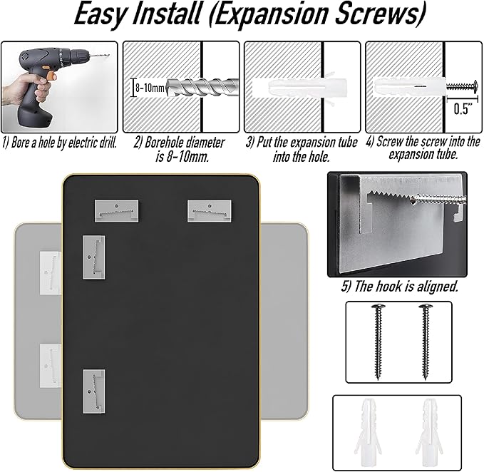 - Easy to install: 1)Wall-Moute:Install the expansion screws (contained in the package) into two drilled holes, and then hang the mirror on the screws;2)Against the wall: Place the mirror directly against the wall (on the table)