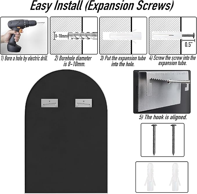 - Easy to Install: Installation instructions and tools are in the package, install the expansion screws on the wall(Required Electric Drill), and then hang the mirror on the screws.