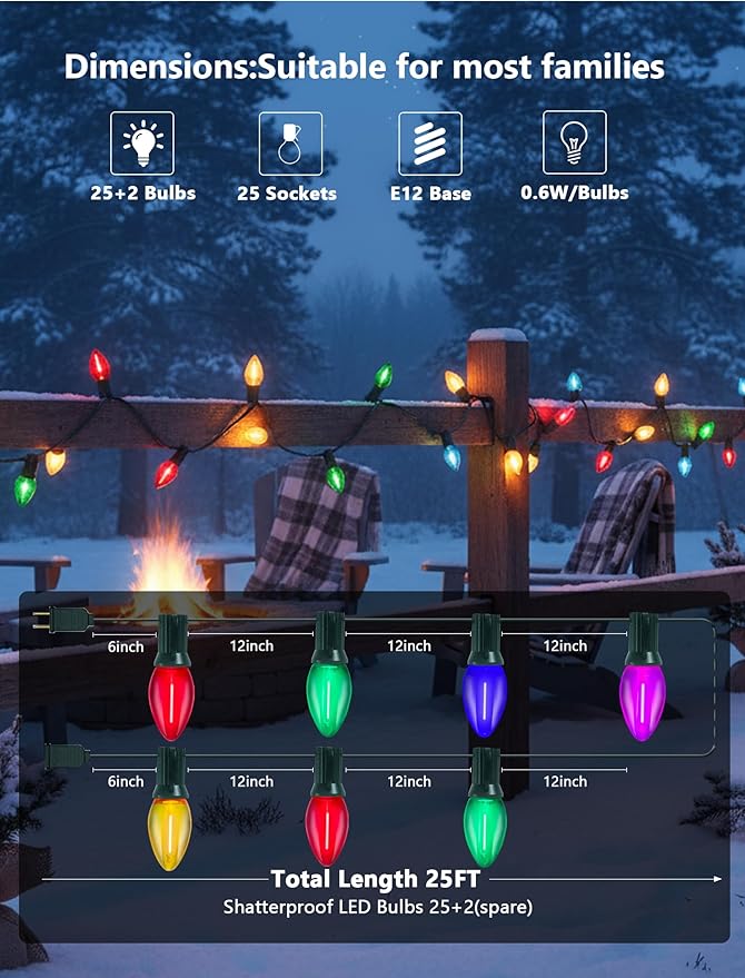 - 25FT Colorful C7 LED Christmas Lights:Add a nostalgic glow to your holiday décor with these 25FT C7 LED Christmas lights. Includes 25 multi colored LED bulbs on a green wire with 12-inch spacing, creating classic old fashioned Christmas lights charm. Perfect for outdoor Christmas lights 25 ft decorations on porches, trees, fences, or vehicles.