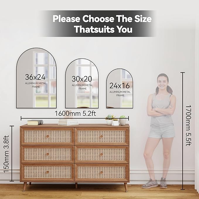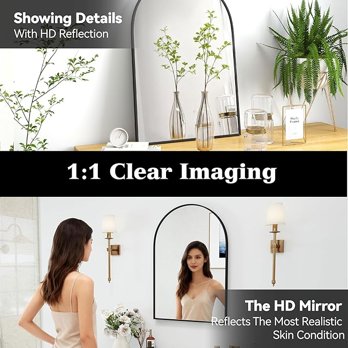 - Mirror Size: Arch 30x20 inch. It can visually make your home more spacious The wall mounted mirror provides a crystal-clear, distortion-free reflection. A best choice for your entryway, bedroom, living room wall decor or over a dresser.