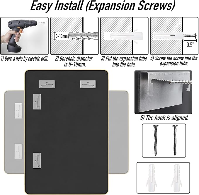 - Easy to install: 1)Wall-Moute:Install the expansion screws (contained in the package) into two drilled holes, and then hang the mirror on the screws;2)Against the wall: Place the mirror directly against the wall (on the table)