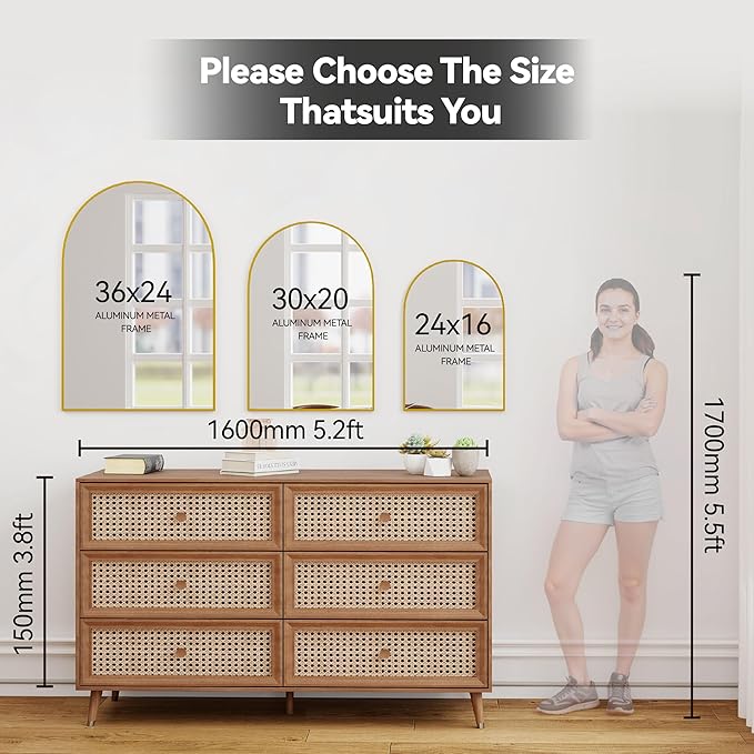 - Mirror Size: Arch 36x24 inch. It can visually make your home more spacious The wall mounted mirror provides a crystal-clear, distortion-free reflection. A best choice for your entryway, bedroom, living room wall decor or over a dresser.