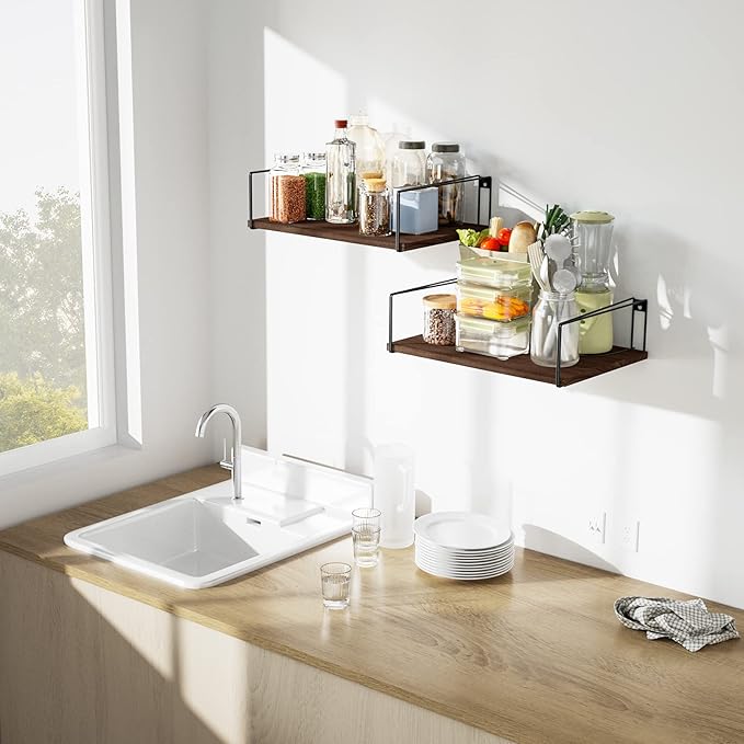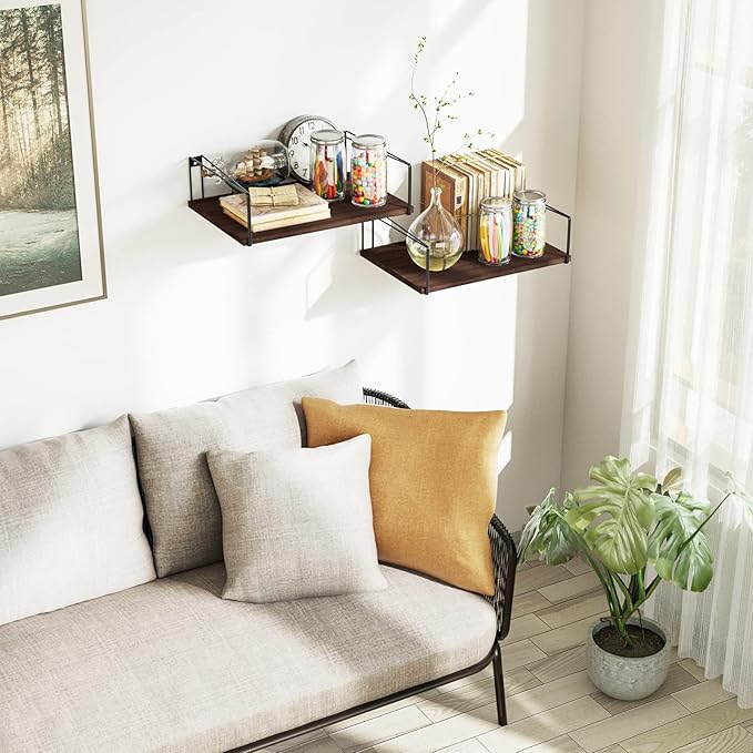 SRIWATANA Wide Floating Shelves, Rustic Wood Wall Shelves Set of 2, Wall Mounted Shelves with Large Capacity for Many Rooms Decor, Dark Walnut