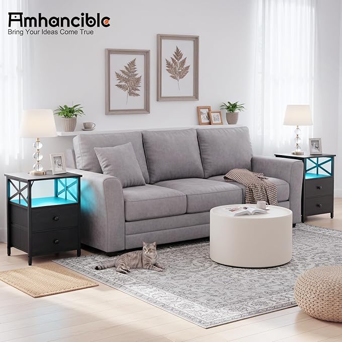 AMHANCIBLE Night Stand Set 2, LED Nightstand with Charging Station, End Tables Living Room with Fabric Drawers, Bedside Table for Bedroom, Black, HET052LBK