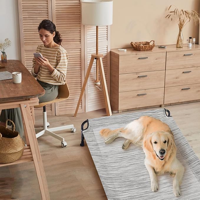 - Stay Cool Ever! Crafted of Textilene mesh fabric, the cooling dog cot allows air to flow, keeping your pets cool while they relax in the heat. Also allow water or urine to go thru, no puddles formed. Besides, the teslin mesh features heat-resistance, sturdy, and breathability.
