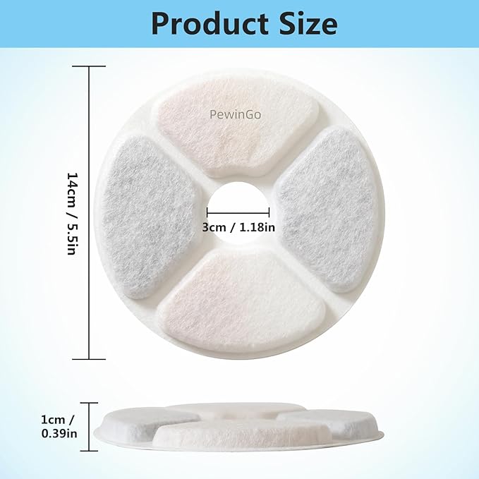 - ✨Compatibility -This pet water fountain filter is suitable for the 3 litre flower cat water fountain and 1.85/60oz cat fountains. Please make sure these cat fountain filter replacement size is compatible with your cat fountain before purchase.;will not fit (1.6 litre) cat fountains. Dimensions: outer diameter 140mm, 5.5inch.