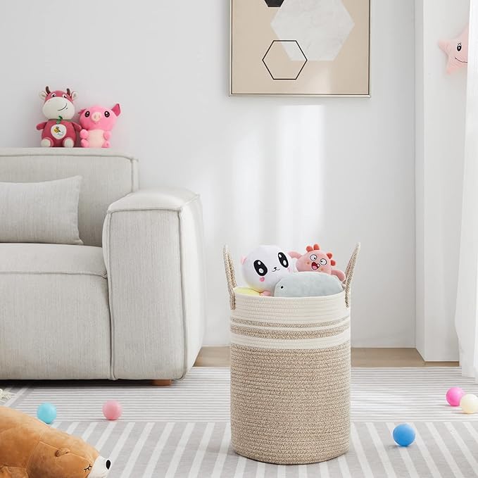 VIPOSCO Tall Laundry Hamper, Woven Rope Storage Basket for Blanket, Toys, Dirty Clothes in Living Room, Bathroom, Bedroom - 30L Brown & White