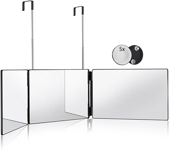HIEEY 3 Way Mirror for Hair Cutting,360 Trifold Mirror with Height Adjustable Telescoping Hooks,and 5X Magnification,for Makeup, Hair Styling