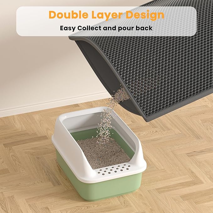 - Anti Tracking EZ Open Edge Litter Mat: Double-layer honeycomb design helps you gather the litter. You just pick up the mat and all the litter falls through and then dump it back in the litter box make it recycling. BEST MAT EVER! No more getting litter stuck to my feet on a daily basis! Large holes is large enough to catch and trap litter. Suitable for lots of type of litter, and kitty litter boxes,hooded,self cleaning litter box.