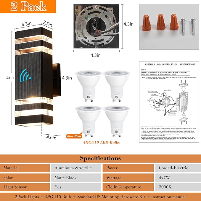 - Energy-Saving Outdoor Porch Lights:Equipped with 2 GU10 LED bulbs (included), this ZSMAIKU outdoor light fixtures offers an impressive 80% energy savings compared to traditional options. With an average lifespan of 25000 hours, enjoy long-lasting brilliance without frequent replacements.Dimension: 2.5*4.3*12in, 4.3*4.3in square mounting plate