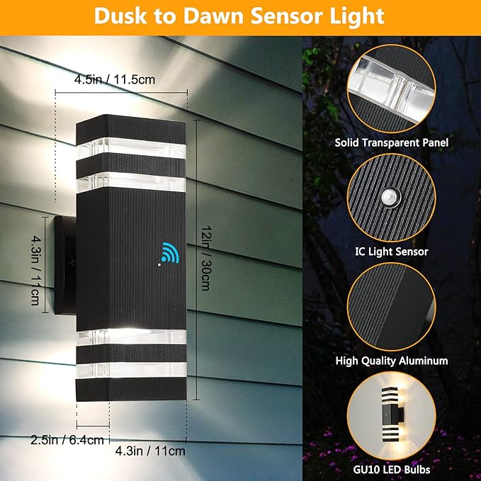 - DUSK TO DAWN SENSOR:Exterior lighting for house built-in high sensitivity light sensor, this modern outdoor wall light can sensitively detect the brightness of the surroundings to adjust the switch. This outdoor wall mount light will auto turn on at night and turn off at daytime, save your bills on electricity