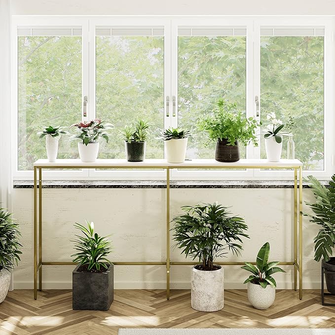 - Modern Minimalist Style: Stylish gold metal frame paired with Classic White form a simple and functional gold console table,living room,hallway,entry way,Elegant design makes it more suitable for home life.