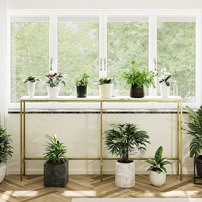 - Modern Minimalist Style: Stylish gold metal frame paired with elegant marble white form a simple and functional gold console table,living room,hallway,entry way,Elegant design makes it more suitable for home life.