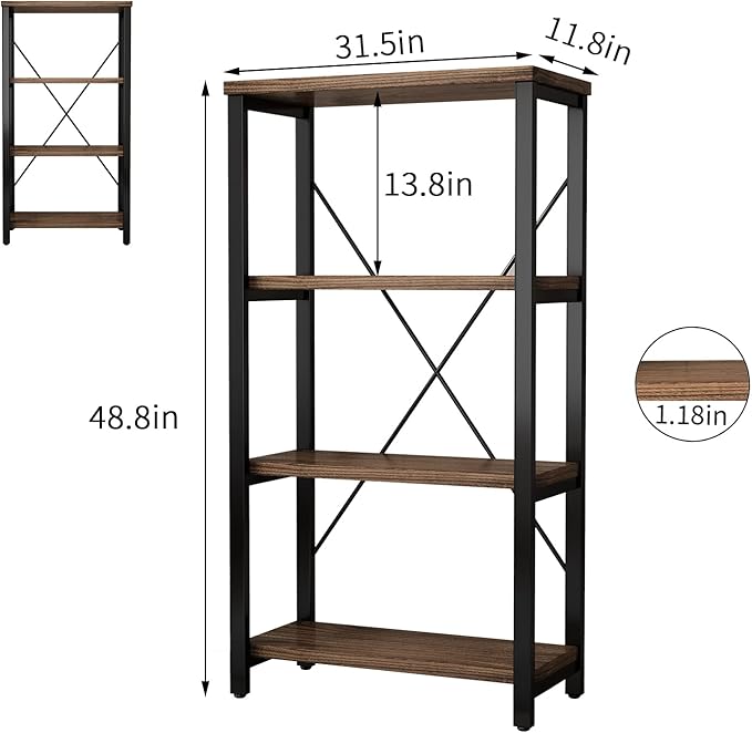 - The bookshelf measures: 11.8"D x 31.5"W x 48.8"H. Each shelf solid wood is 1.19" thick,Each shelf can hold up to 200 lbs,and crafted of wrought metal in a matte black finish.Real solid wood board,Which is non-toxic and can reduce formaldehyde emission.