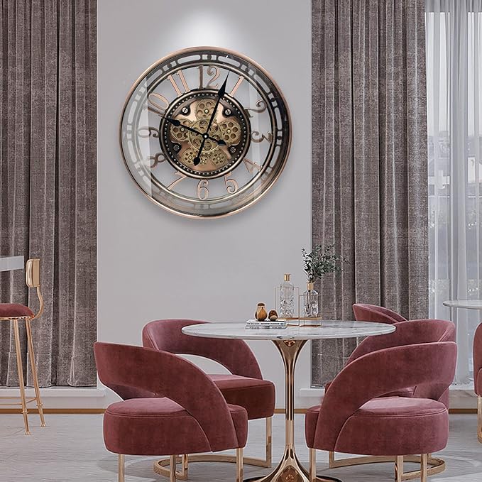 - đ§ăLarge Wall Clock with Unique DesignăThis modern wall clock is bigger than 20 inch, large cut out skeleton style, metal Arabic Numerals with aluminium dial and plating brushed copper gold finished, wheels in various different sizes are really turning in the central, clear HD tempered glass lens protects the clock face from dust, and keep it safe and away from broken, It's so COOL.