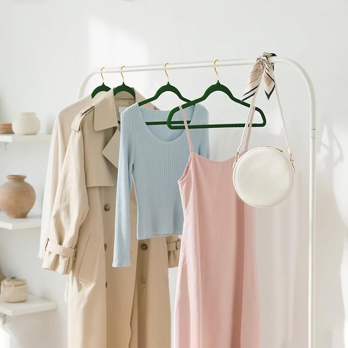 - [Hanging All Clothes]: The Premium velvet adult clothes hangers are perfect hanging your shirts, pants, jackets, dresses and more. A Golden-plated 360-degree-swivel hook on the velvet coat hangers helps you move the hangers easily when you need access to your clothes to get from hangers.