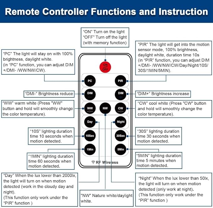 - 2 Optional Lighting Modes: 1). Stay on mode (Press "PC" button): use as a normal light, will stay on non motion sensor, you can adjust brightness and color temperature; 2). Motion Sensor Mode (Press "PIR" button): make the sensor work, you can adjust brightness and color temperature.