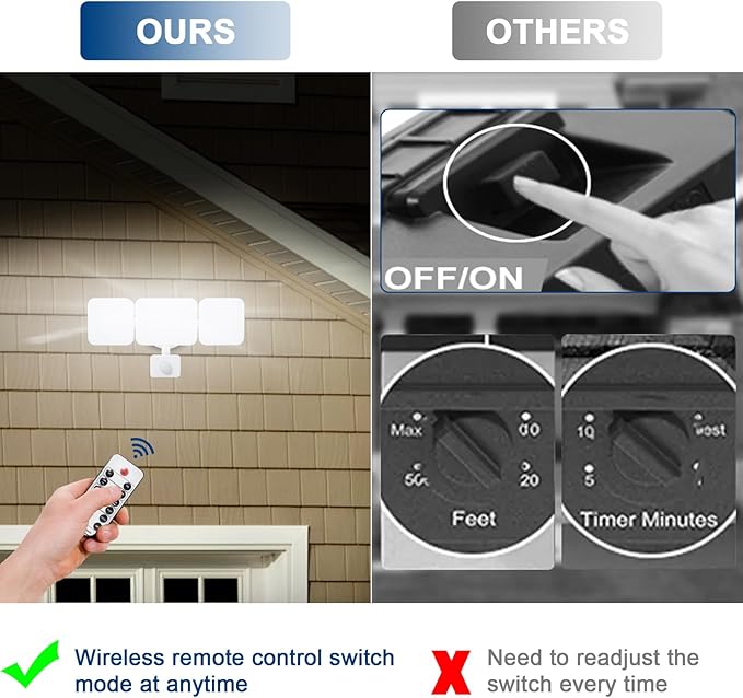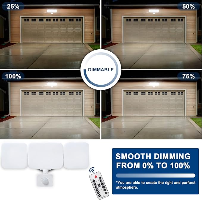 - [ Remote Control Outdoor Flood Light ] The selectable CCT motion floodlight is controlled by remote controller. You can easily adjust all settings (brightness dimmable, warm white, daylight white, cool white, lighting mode, full light duration time, etc.) to customize your own security mode by remote controller. Compared with the conventional security light, this security light avoid repeatedly climbing ladder to adjust the security light settings, more convenient and safe!