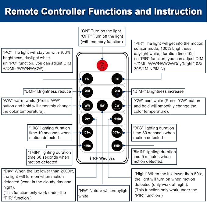 - [ 2 Optional Lighting Modes ] 1). Stay on mode (Press "PC" button): use as a normal light, will stay on non motion sensor, you can adjust brightness and color temperature; 2). Motion Sensor Mode (Press "PIR" button): make the sensor work, you can adjust brightness and color temperature.