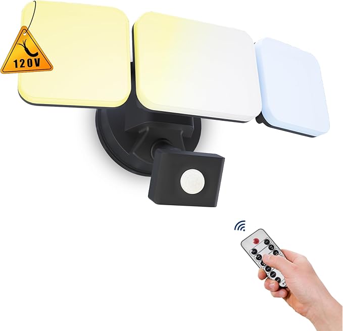 - << Tunable White and Dimmable >> This selectable CCT motion flood light with warm white 3000K, Daylight White 4500K, Cool White 6000K color temperature selectable. And you can adjust the brightness via remote controller too, the brightness adjustment range is 10% to 100%, you can set the most suitable light to achieve a wide range of flexible lighting.. (With memory function)