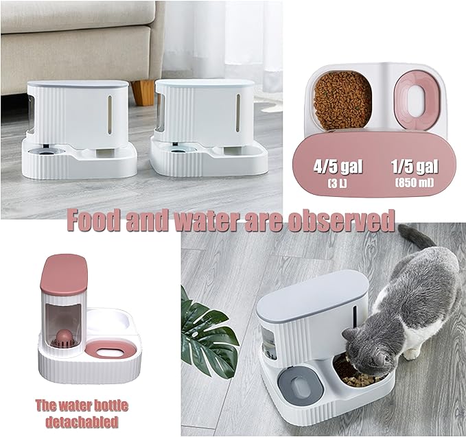 - [Practical 2 In 1]: More portable and save space pet feeder food and water dispensers set and hard to dump! This automatic gravity water bowl cat feeder functions as both a cat water dispenser for indoor pets, it can hold 4/5 gallons (3 liters)of dry cat or dog food and 1/5 gallon(850ml) of water container for cats or small dogs under 20 lbs or rabbits and other small animal.