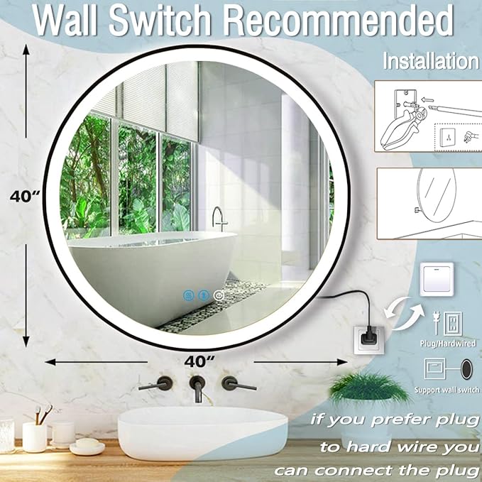 - 🛠【Freely Choose Hardwired or Plug & Power-off Light Memory】Each mirror comes with a standard two-prong plug that suitable for a wide voltage range of 100V to 240V.Or you can choose hardwiring, connecting to your switch on wall.The mirror has light memory function. When it is turned on again, it will display the brightness and color temperature when it was turned off last time.Coming with accessories bag to hanging the mirror, just reading the instruction carefully.Easy and safe to install.