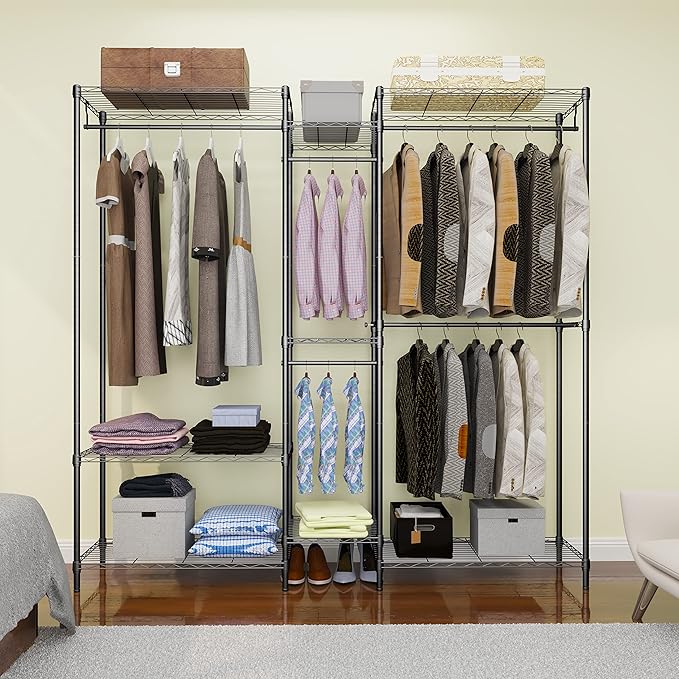 - MULTIFUNCTION: Closet Storage Rack with 5 detachable hanging rods is ideal for hanging suits, coats, pants, shirts or other heavy clothes, The three small shelves is great for placing accessories, bedding, shoes, etc. Easy access to bedroom, cloakroom, clothing store, laundry room, walk-in closet and more.
