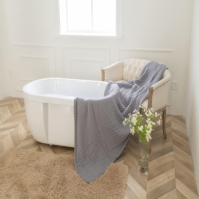- Finely woven from eco-friendly 100% premium quality breathable durable natural muslin cotton for softness, tear-resistant strength and maximum absorption.Light grey Blanket measuring 55 x 75 inches