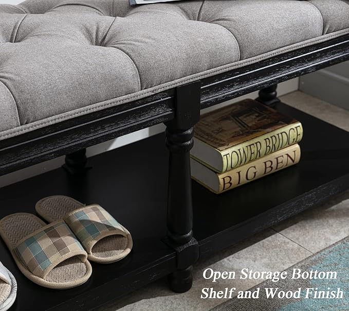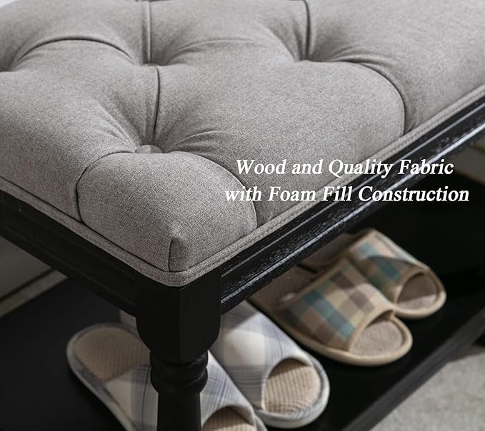 DUOMAY Mid-Century Tufted Storage Bench with Shelf, Linen Upholstered Farmhouse Entryway Shoe Bench Ottoman Bed End Stool for Bedroom Living Room Dining Room, Black Wood Frame, Grey