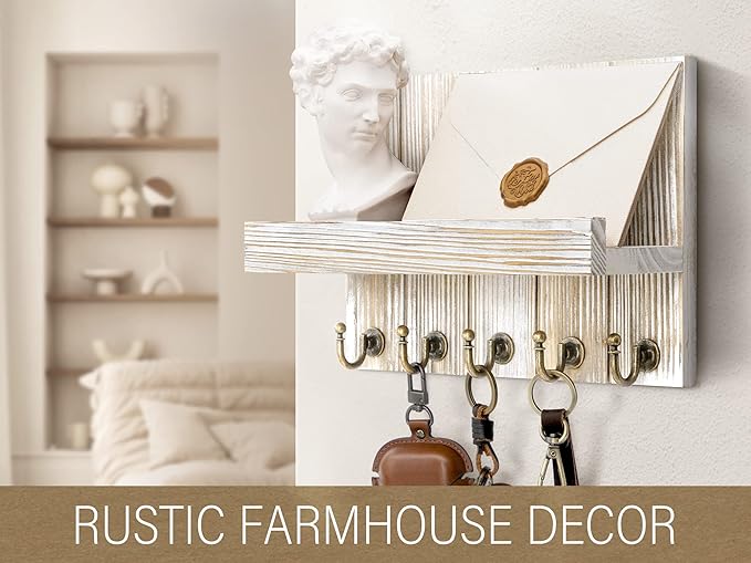 - 【GREAT HANDMADE KEY HOLDER】 With antiqued finish enhance the authenticity of our mail and key holder for wall. Five decorative hooks on a farmhouse house decor keep your home tidy. Retro rustic design will add a touch of color to your home decor aesthetic.